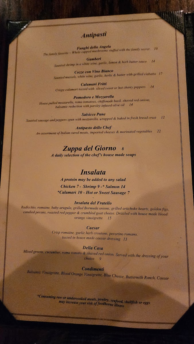 Welcome to Fratello's Italian Tavern, a charming culinary haven located at 1050 E Montague Ave in Charleston, SC. Here, guests are treated to a delightful dive into authentic Italian cuisine. Each dish sings with flavor, starting with the Antipasto Dello Chef, a delectable assortment of cured meats, cheeses, and marinated veggies for $15. For a satisfying main, the Spaghetti Con Polpette features classic meatballs in marinara at $17, delivering comfort in every bite.